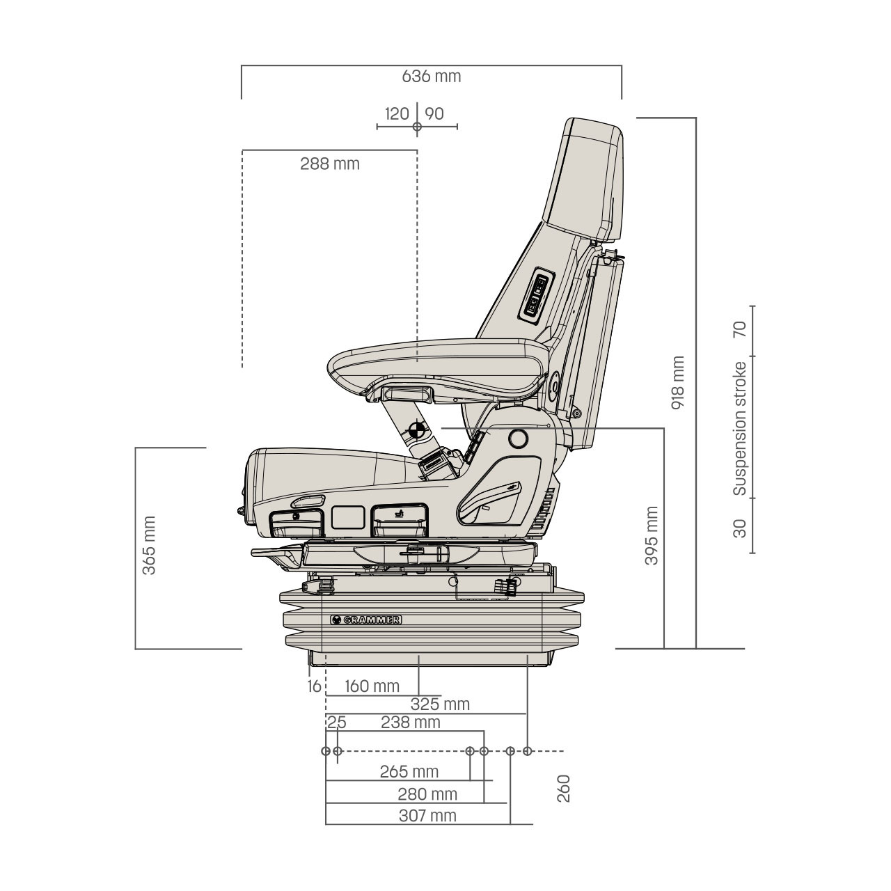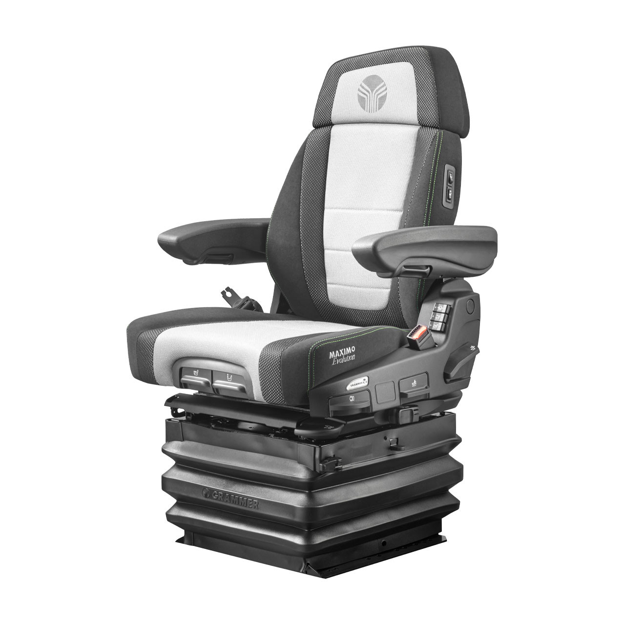 Siège agricole GRAMMER MAXIMO EVOLUTION DYNAMIC à suspension pneumatique 12 volts bénéfice de l'APS : système de positionnement automatique avec réglage du poids électronique. Le siège agricole GRAMMER MAXIMO EVOLUTION DYNAMIC à de multiples réglages comme sa hauteur, son inclinaison ainsi que sa profondeur. Equipé d'un soutien lombaire pneumatique pour encore plus de confort, une assise large de 550 mm ainsi que d'un chauffage et d'une climatisation. Le siège agricole GRAMMER MAXIMO EVOLUTION DYNAMIC est très complet, il est également équipé d'accoudoirs en tissu, réglables en hauteur, rabattable et inclinables. Et enfin, il est doté d'une embrase pivotante de 20° droite/gauche.