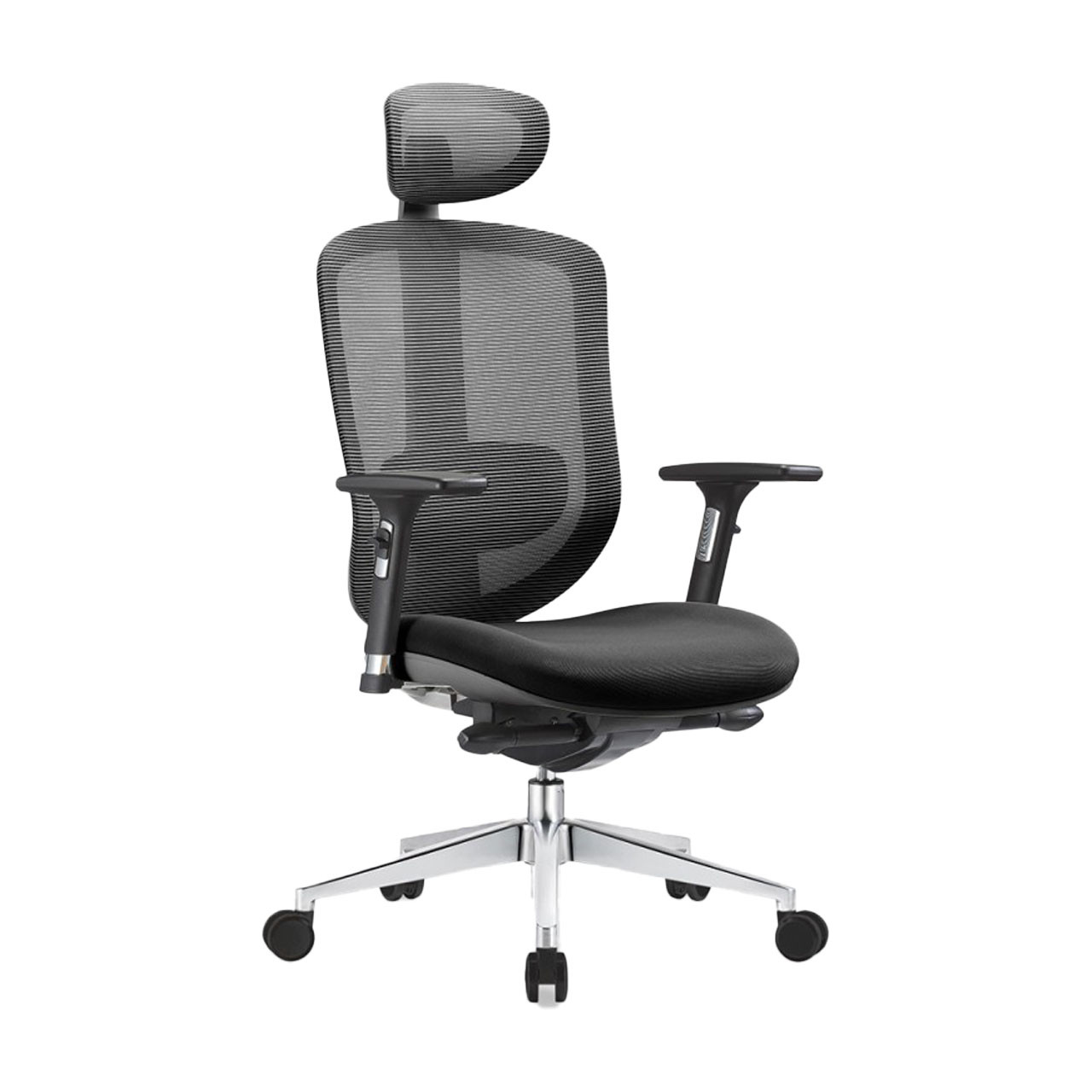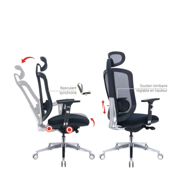 Siège ou fauteuil de bureau "Paris". Le siège est un fauteuil professionnel avec un dossier en tissu résille. L'assise dispose d'une mousse à mémoire de forme d'une densité de 50Kg/m3. Le siège Paris à de nombreux réglages possibles, comme la hauteur et la translation ainsi qu'un soutien lombaire. Ses accoudoirs réglables ont un toucher soft touch. Le siège de bureau Paris a un piètement 5 branches aluminium avec vérin chromé.