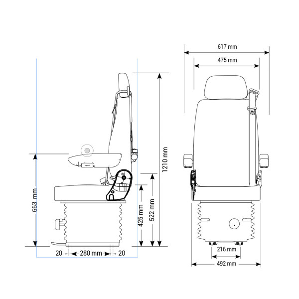 Le siège poids lourds AZUR 6000 à suspension mécanique trouvera également sa place dans les engins de travaux publics ainsi que les véhicules agricoles. Le siège poids lourds AZUR 6000 dispose de nombreux réglage du dossier et de l'assise, il a une course de suspension de 95 mm, et la hauteur se règle par incréments fins jusqu'à 65 mm. Le siège poids lourds AZUR 6000 permet un réglage du poids du conducteur jusqu'à 130 Kg. Le siège poids lourds AZUR 6000 est équipé d'un appui-tête et d'accoudoirs réglables.